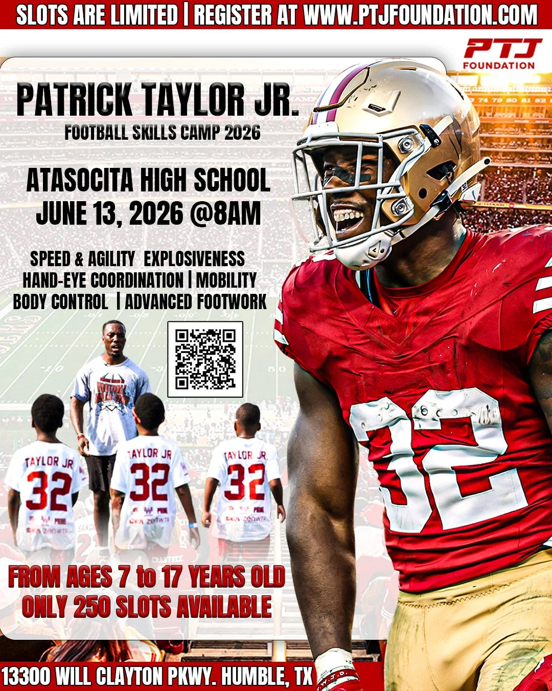 The Patrick Taylor Jr. Football Camp will be held at Atascocita High School on Saturday, June 13, 2026, from 8:00 am to 1:00 pm. The camp will focus on speed and agility, explosiveness, hand/eye coordination, mobility, body control, and advanced footwork. Only 250 slots are available, so register quickly.